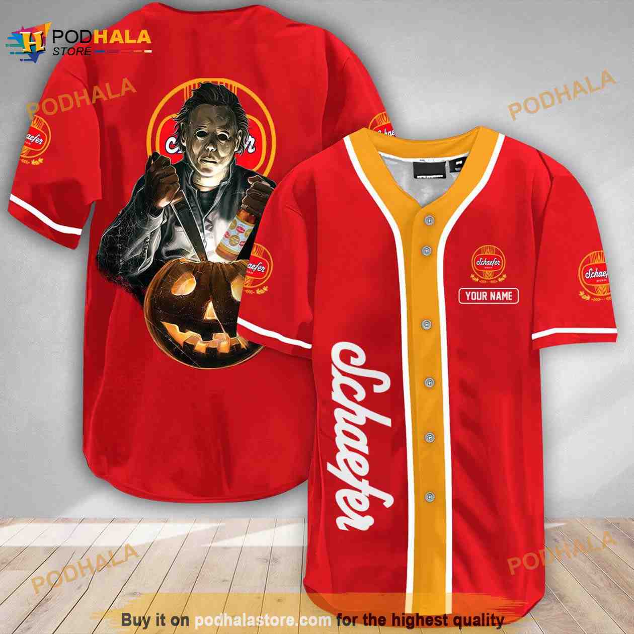 Custom Name Scary Michael Myers Pumpkin Schaefer Beer 3D Baseball Jersey