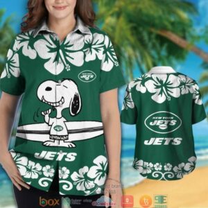 - This New York Jets Snoopy Hibiscus Hawaiian Shirt, Short feels soft and smooth, making it comfortable to wear, short material: 95% Polyester and 5% spandex.
